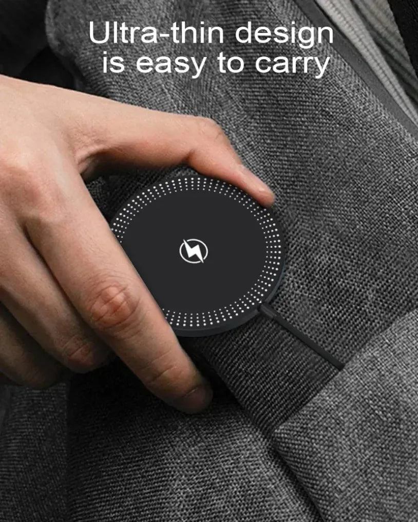 【Metal & Portable Design】The high-quality metal material exhibits a unique luster, avoids scratches or fingerprints, not only keep perfect appearance, but also more durable. Only 0.23 inch thin, just like the smallest & lightest wireless macsafe charger with the 1m long cable. Free up more space, it can be put into backpacks, pockets or bags.