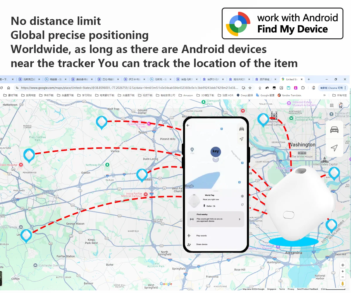 Global tracking, quick location updates: When your item leaves Bluetooth range, as long as there is an Android device near the World Tag, you can view its location on Google Maps through the Google Find My Device app. You can also share your location with your loved ones or family, making you feel more at ease.