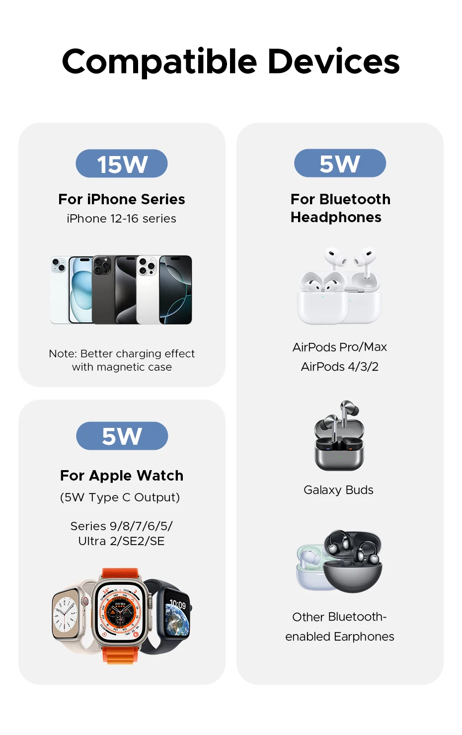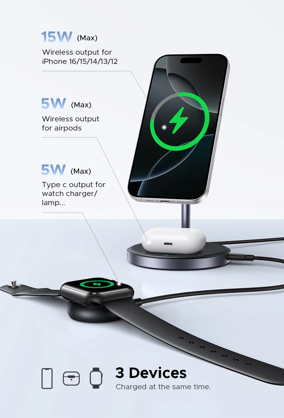 15W (max) output for iPhone series, 5W (max) output for AirPods.5W type c port for watch charger/lamp etc.